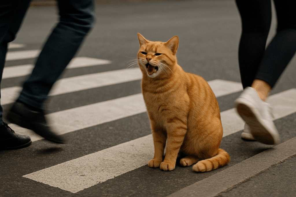 Ilmiö on kerännyt jo yli 1,2 miljoonaa katselukertaa sosiaalisessa mediassa. Videolla kissa jopa maukuu autoille, jotka eivät malta pysähtyä.